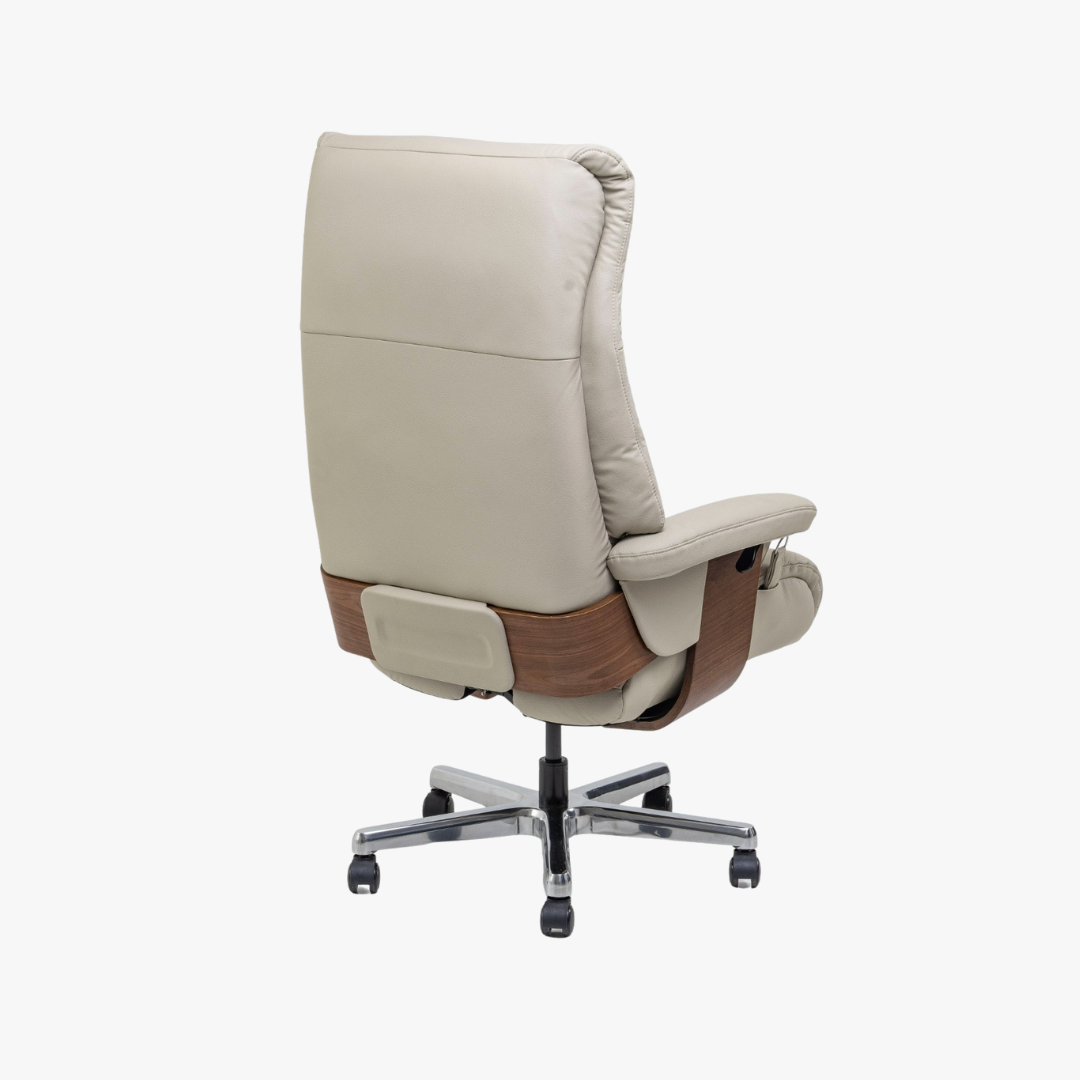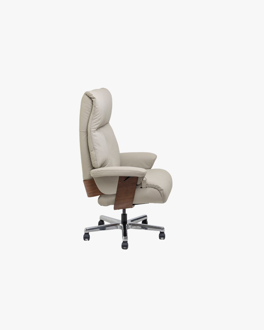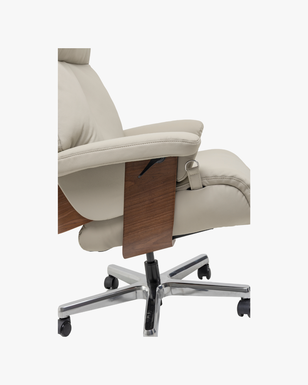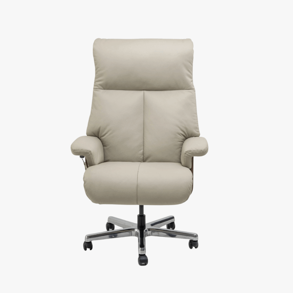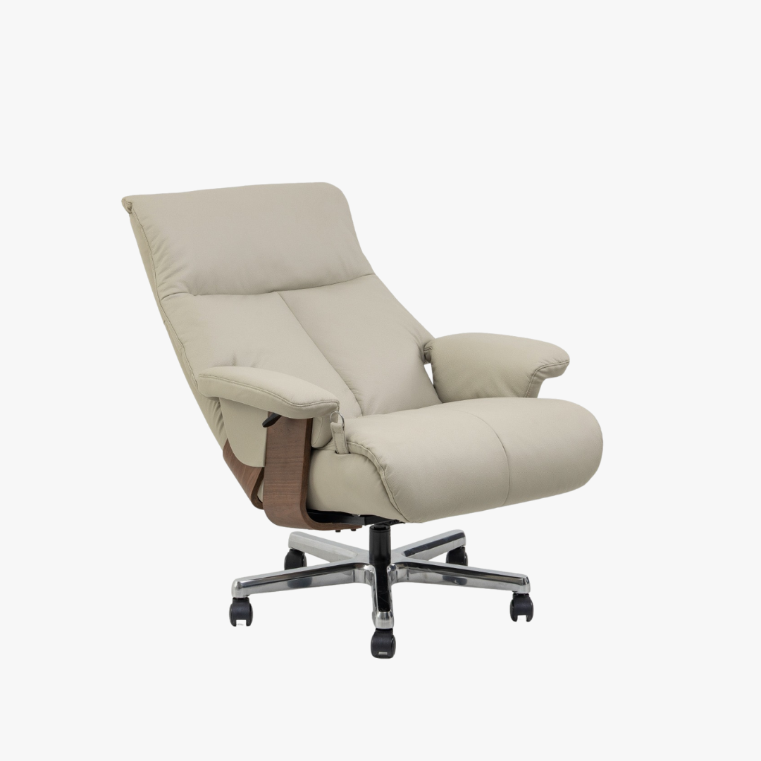 Poltrona reclinável, giratória, acionador lateral somente para reclínio do encosto, ajuste de altura.